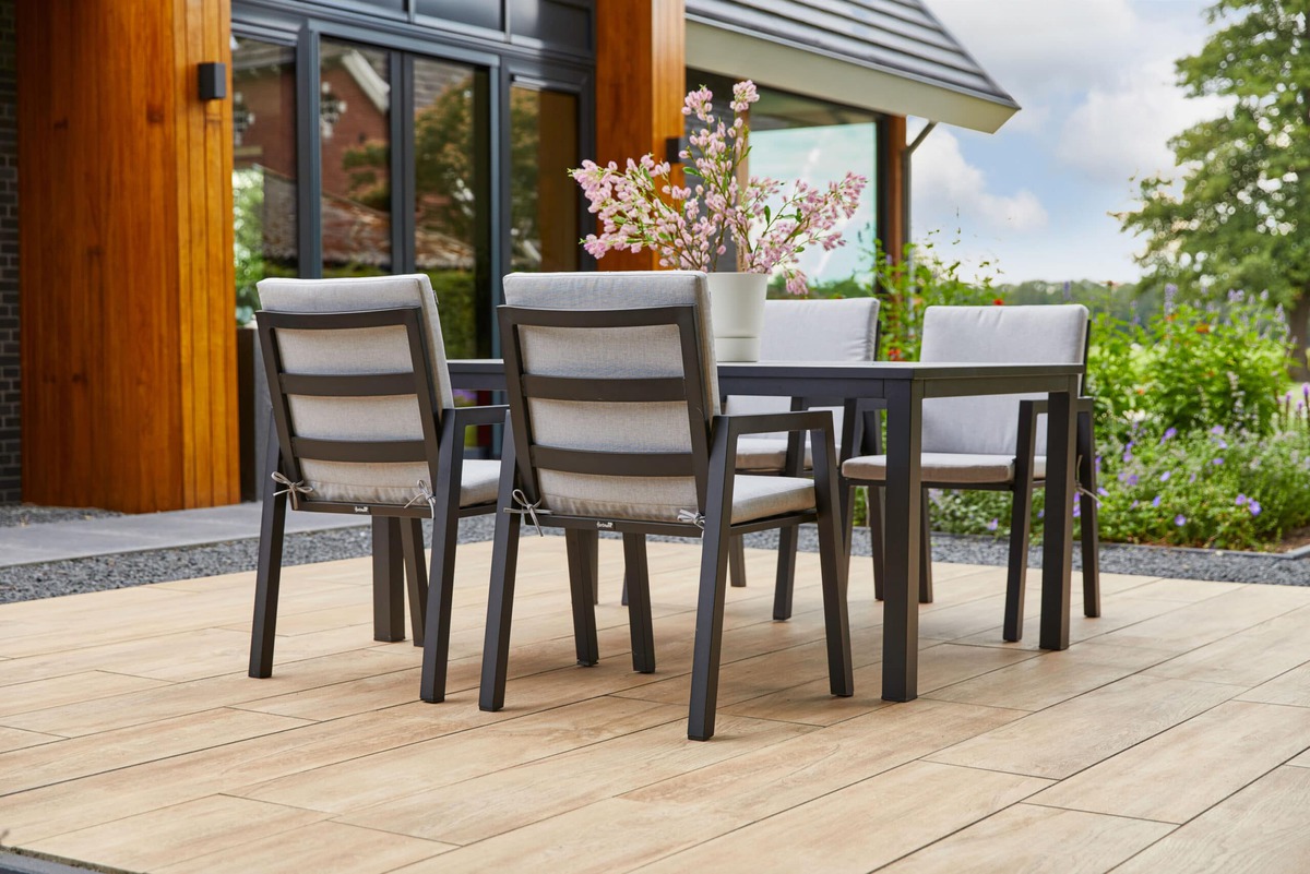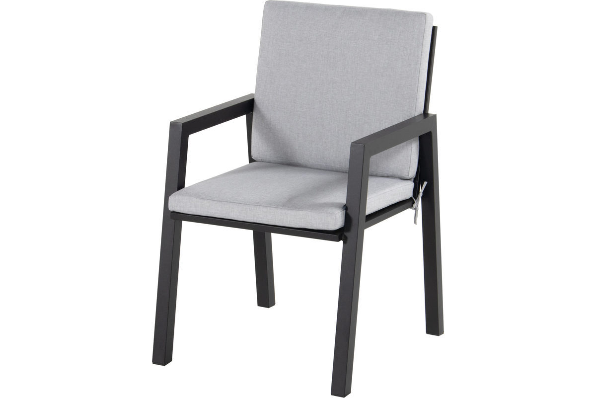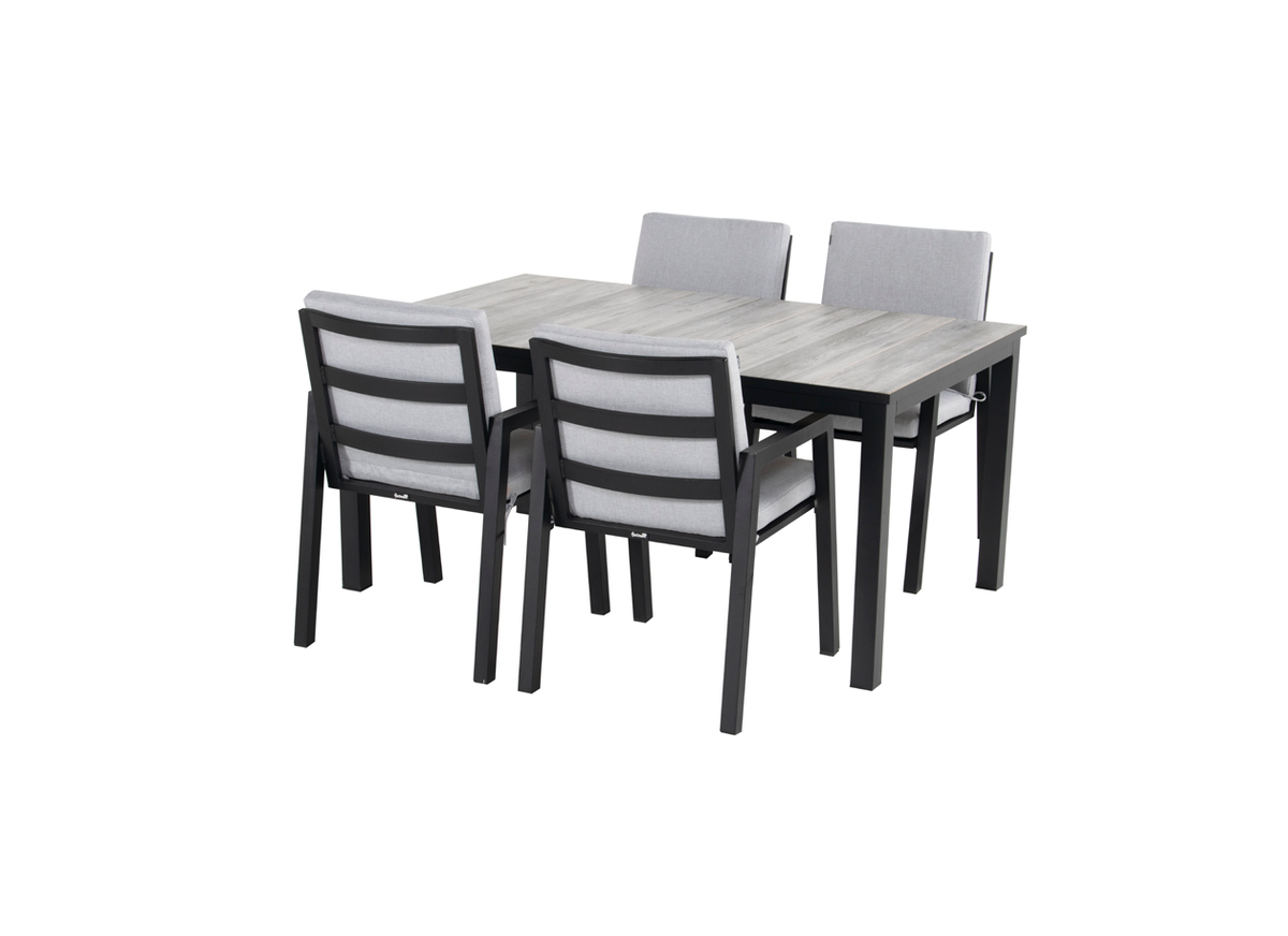 Moderne og robust spisegruppe i sortlakkert aluminium. Bordplate i keramisk flis. Stolene har løs pute i lysegrå olefin og er stabelbare.