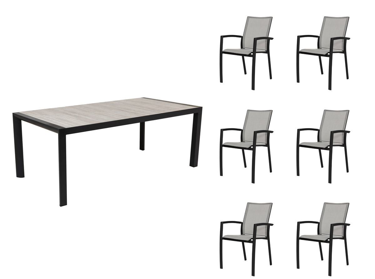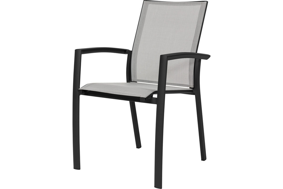 Spisestol i sort aluminium og grå textilene, stabelbar.