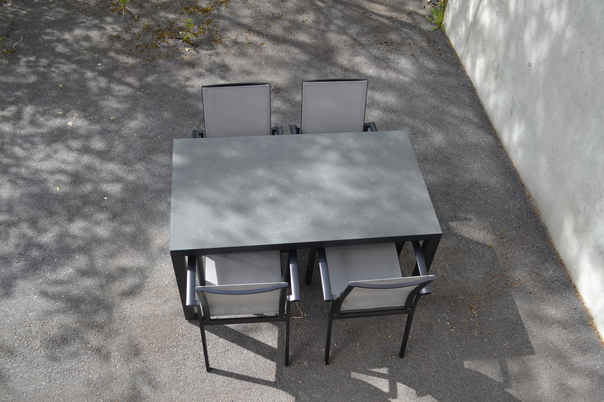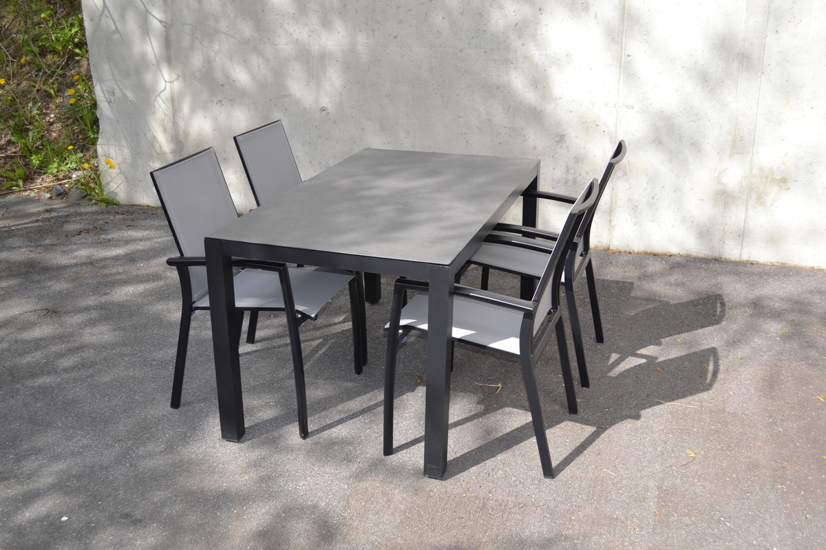 Spisestol stabelbar i sortlakkert aluminium og grå textilene.