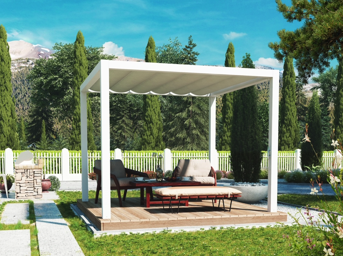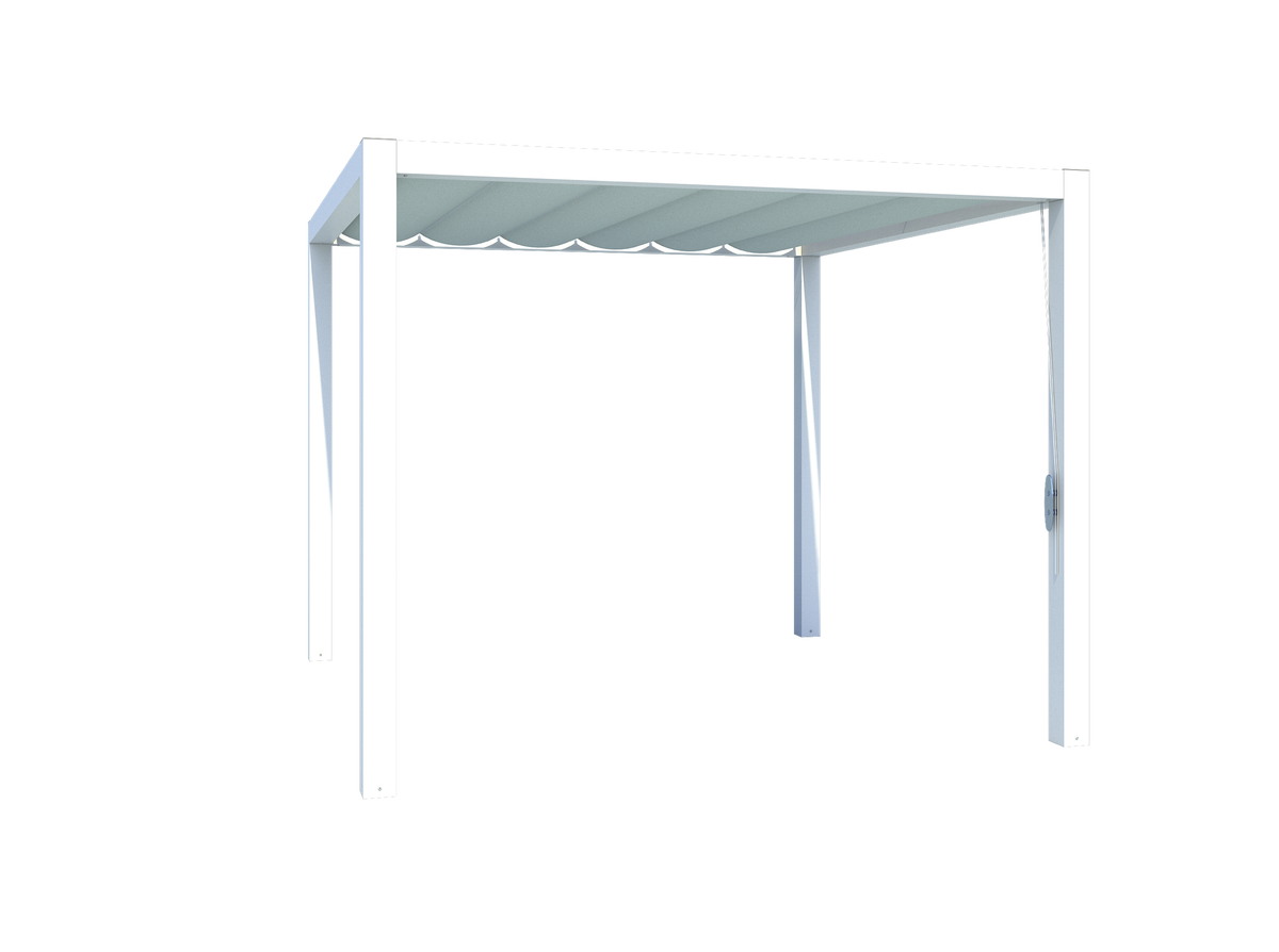 Taket er i en sterk værbestandig polyester i fargen lys grå.